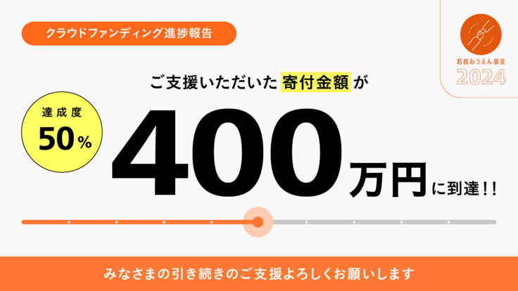 目標まで50%とまだ先は長いですが若者おうえん基金助成や若者たちの体験就労プログラムを実施するためにも頑張りたいと思います。