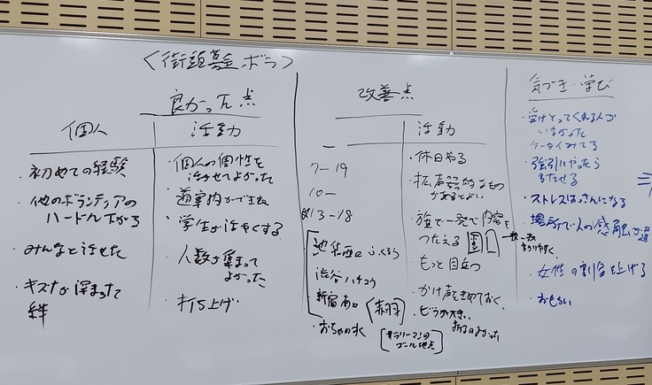 当日参加した6人が街頭募金を行って、良かった点、改善点、気づき・学びをシェアしましたが、個人的には活動を一緒に行うことでつながりが出来たことがよかったです。