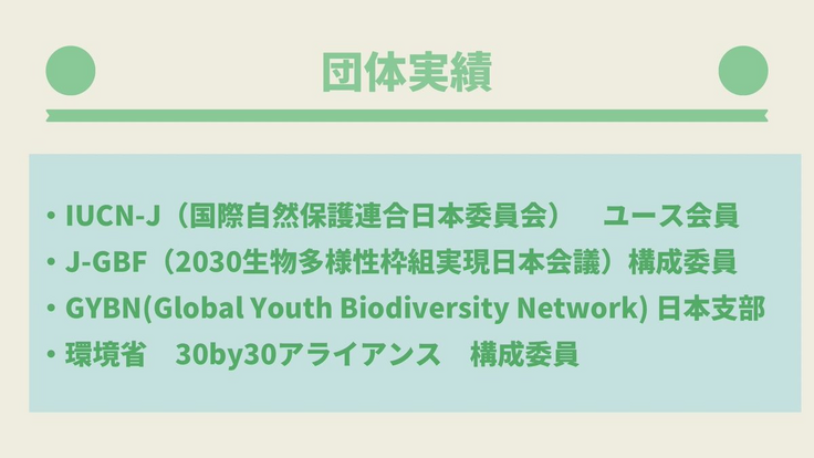 Global Youth Biodiversity Network(生物多様性損失を防ぐために団結した、ユース世代の組織・個人のネットワーク 通称:GYBN)のブースに、当団体も日本支部として、活動紹介を置かせていただく予定です。この展示に参加することで、世界各国のユースに日本ユースの活動を知ってもらうと同時に、彼らのバックグランドやステートメントを吸収し、今後日本で生物多様性について広める際に活かします。