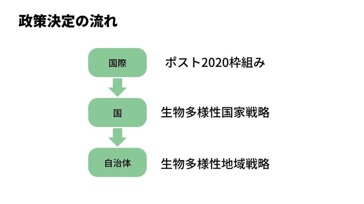 現在、日本では、生物多様性の重要性は浸透しておらず、環境に関心のある方々だけで動いている現状があります。徐々に国や大企業等にその重要性が浸透してきましたが、本来ならば、そこから自治体や中小企業、そして生物多様性を知らない一般市民へ浸透していかなければなりません。国際機関や国がその重要性を訴えかけていますが、その取り組みはまだ始まったばかりで不十分であったり、関心がなく、聞く姿勢ができあがってない方が多く、聞き手がいない現状です。そこで、私たちは、国際の情報を国だけでなく、自治体、そしてまずは生物多様性に関心のある市民へと届ける必要があると考えています。