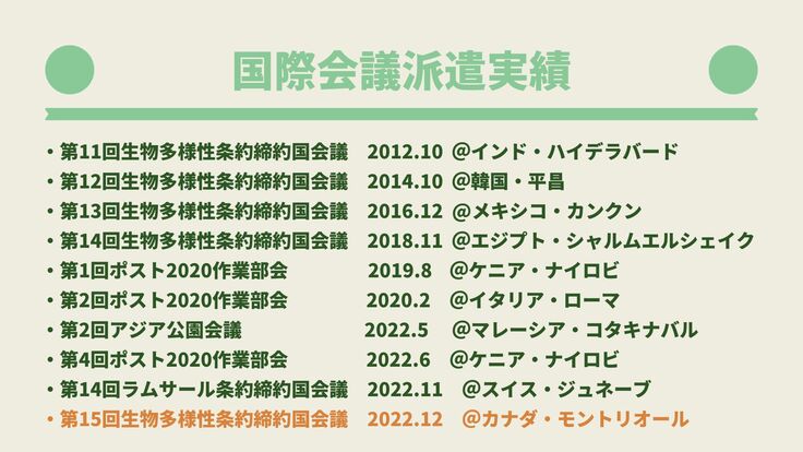 生物多様性わかものネットワークのメンバーが、第15回生物多様性条約締約国会議(CBDCOP15)へ参加し、ブースを出展する資金です。 メンバーの渡航費、ブースの出展・運営費、配布物や名刺の印刷代に使用します。 CBDCOP15へ参加している期間は、現地にてブースの展示を行ったり、現地の様子や議題の進行などを随時発信・報告いたします。
