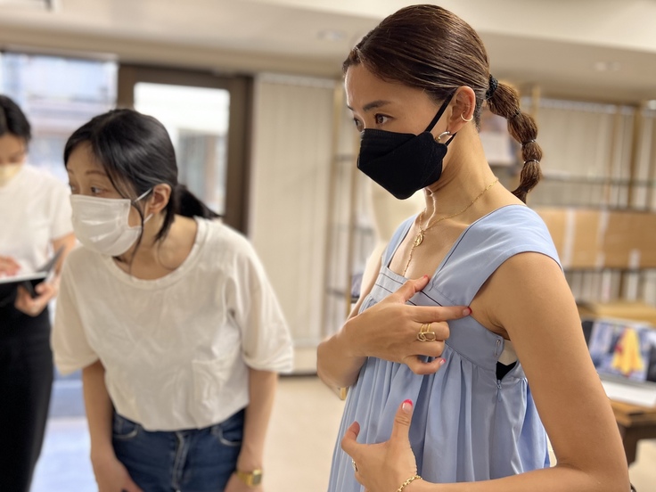 二の腕の気になるところが隠れるよう外側につける工夫や、胸元を気にしなくてよい絶妙な胸の開き、そしてフワッとAラインのシルエットが綺麗に出るように、職人さん達と思考錯誤しながら作ったドレスです!