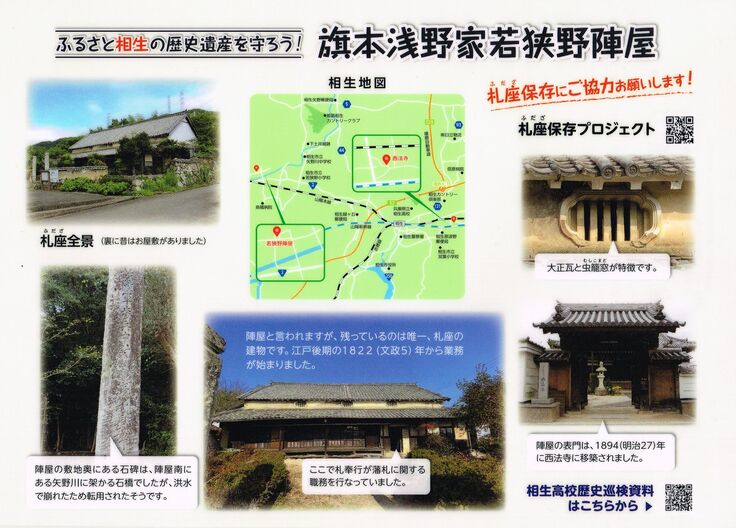 若狭野陣屋の札座は、単体としても文化財・歴史的建造物ですが、東寺領矢野荘・旗本浅野家領と結びつけることによって価値が高まります。こうして、札座を日本史学びツーリズムの資料館にしようと、考えがまとまりました。