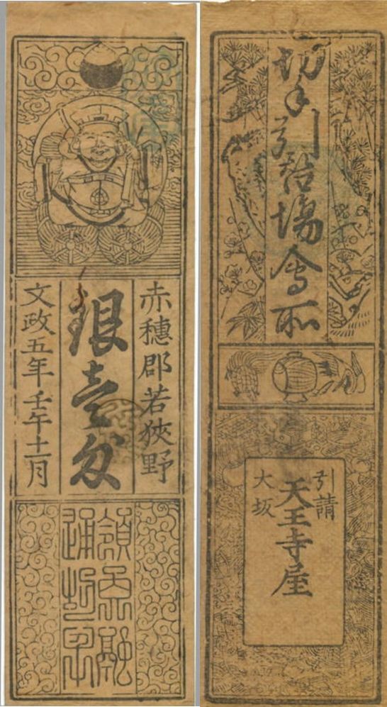 藩札は、ヤフオクで安く手に入ります。江戸時代のものが何故あんなに安いのかと思っていたら、藩札の発行高はとてつもなく多かったんですね。だから、たくさん残っていて、だから、ヤフオクで安い値段しかつかない。