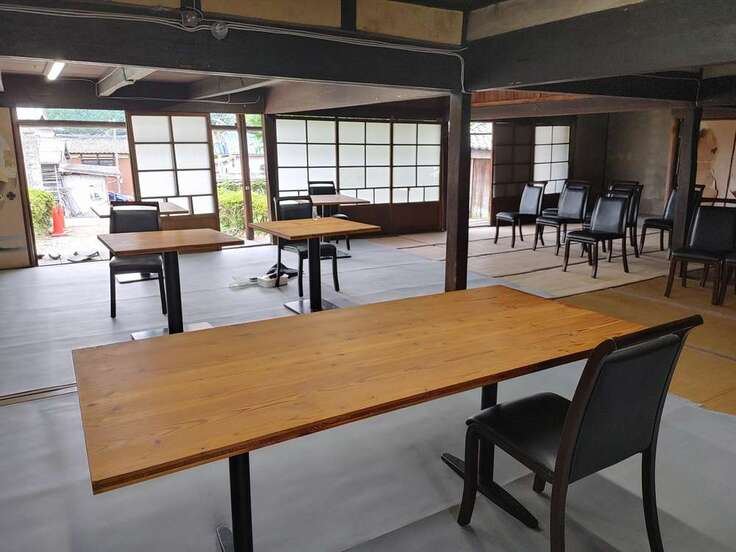 寄付していただいたテーブルと椅子を並べました。きちんと並べますと20席程度のライブハウス風の部屋になります。長尺シートはとりあえず二部屋で16畳敷いています。