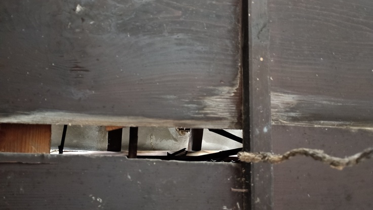 室内です。北側の増設した部屋の傷みがひどいので、この部屋は閉鎖または取り壊したいと考えています。札座は江戸時代に建築され、大正時代にお寺に改装するための増築が行われました。増築部分は資材の質が悪く、将来の大規模補修では取り壊して、江戸時代の建物に戻す予定です。