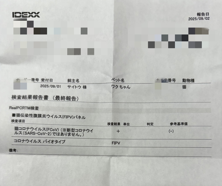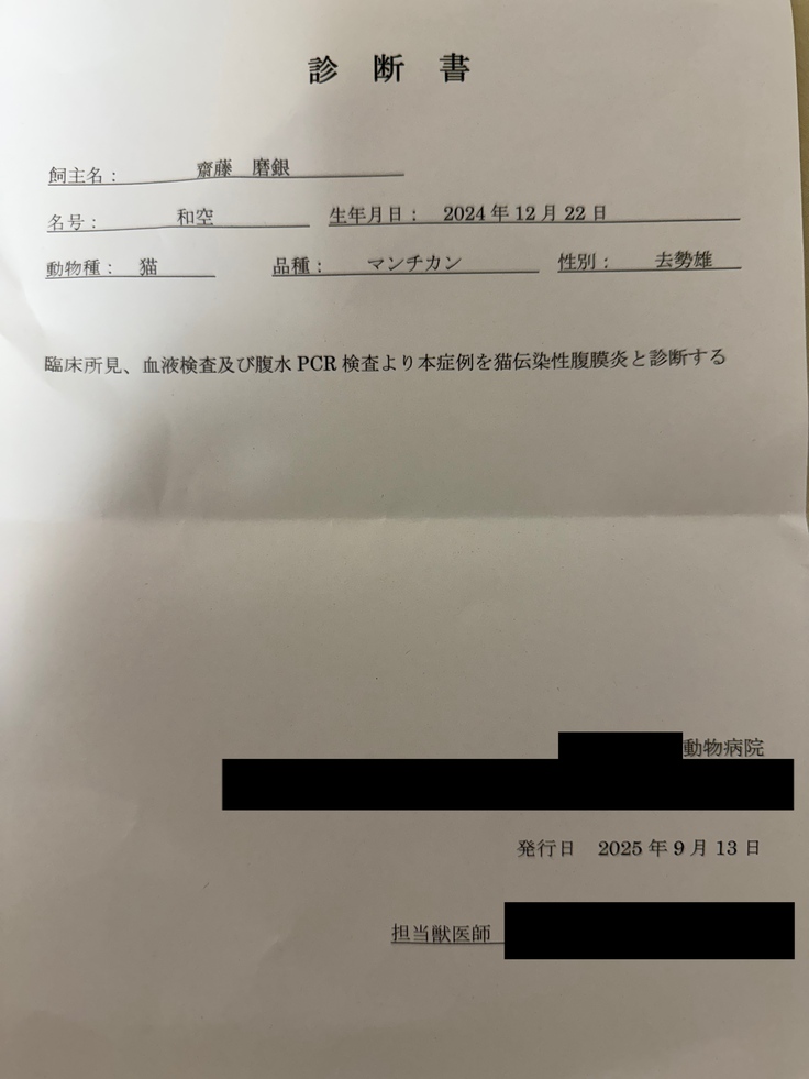 2025/9/2に【FIP 猫伝染性腹膜炎】と診断されました。