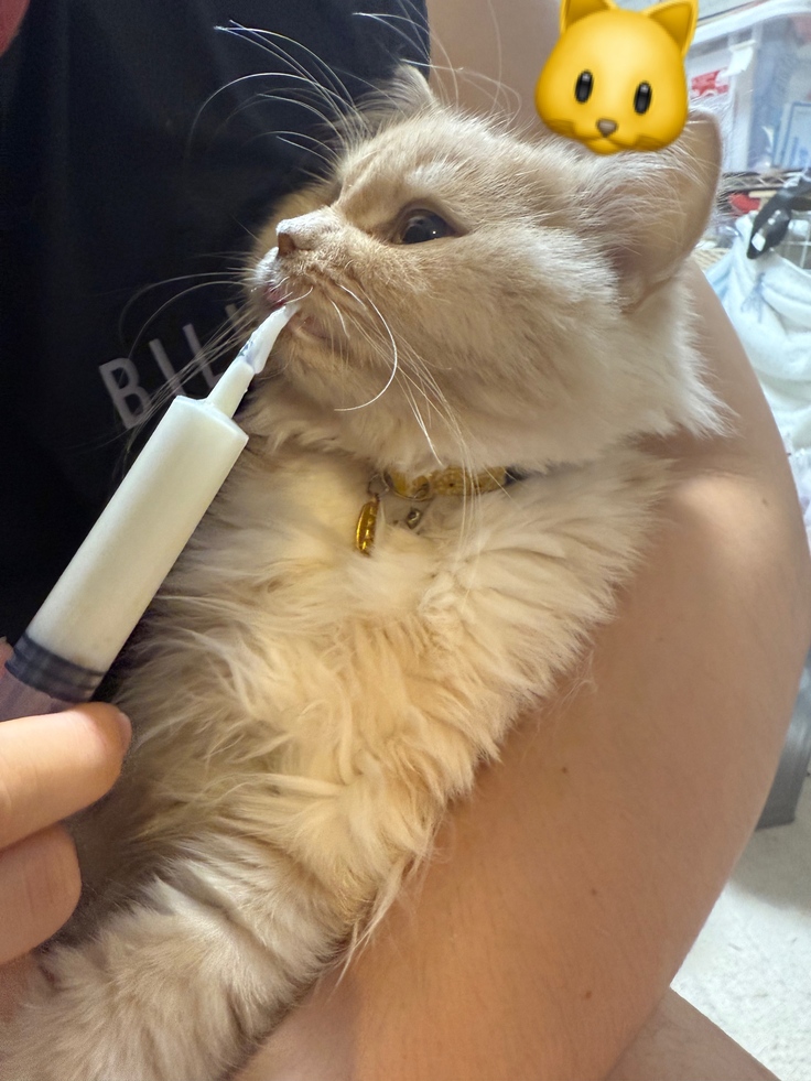 現在は、とてもぐったりしていて自分でご飯も食べられません。飼い主たちで、シリンジでミルクやエナジーチュールを溶いてあげています。