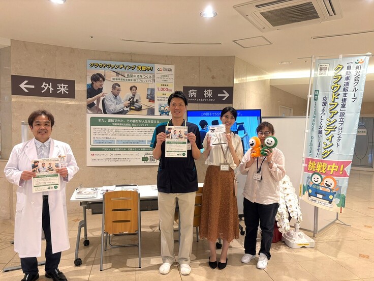 山田病院の1Fホールに、クラウドファンディングの紹介ブースとのぼりを設置しました。