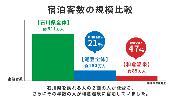 平成 27 年と少々古い数値ですが、この傾向は大きく変わってはいません。平成 27 年石川県全体の宿泊者数は約 811万人、うち能登エリアでの宿泊者数は約 180 万人、和倉温泉エリアの宿泊者数は約85万人。この比率をみると、石川県全体の宿泊者数の約21%が能登へ来訪宿泊、能登へ来訪宿泊した人のうち約 47%が和倉温泉エリアに宿泊していることになります。