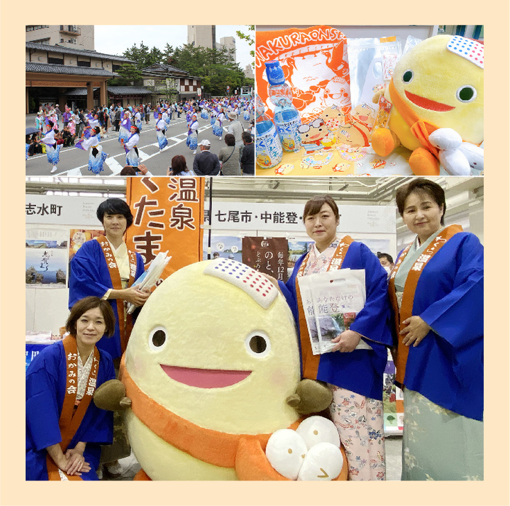 和倉温泉観光協会は旅館や商店、町会、交通など観光サービス事業者の方々で構成されています。花火大会や能登よさこい祭りなどの実施をはじめ、生誕15周年を迎えた和倉温泉PRキャラクター「和倉温泉わくたまくん」のグッズ開発と販売、全国出向宣伝などで、和倉温泉の魅力を発信しています。