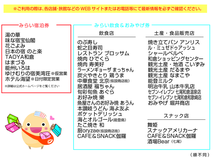 なお、券は発送しておりますので、お手元に届いていない場合は和倉温泉観光協会までご連絡ください。