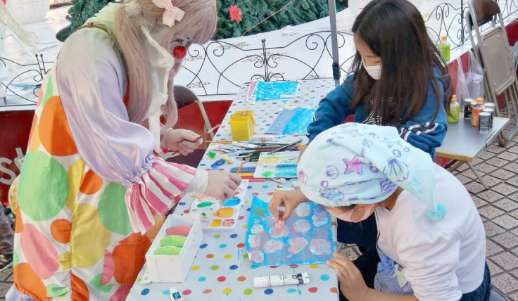 パフォーマンスを始めると、子どもたちはキラキラの笑顔でクラウンの動きを見たり、ちょっかい出して触ったり、一緒に遊んでくれます。