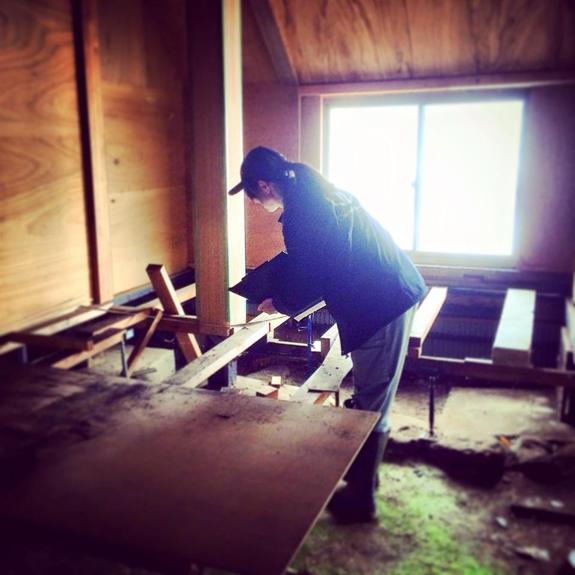 前のオーナーがセルフ施工を施している合板を剥がしながら壁や梁の状況を見ていきます。