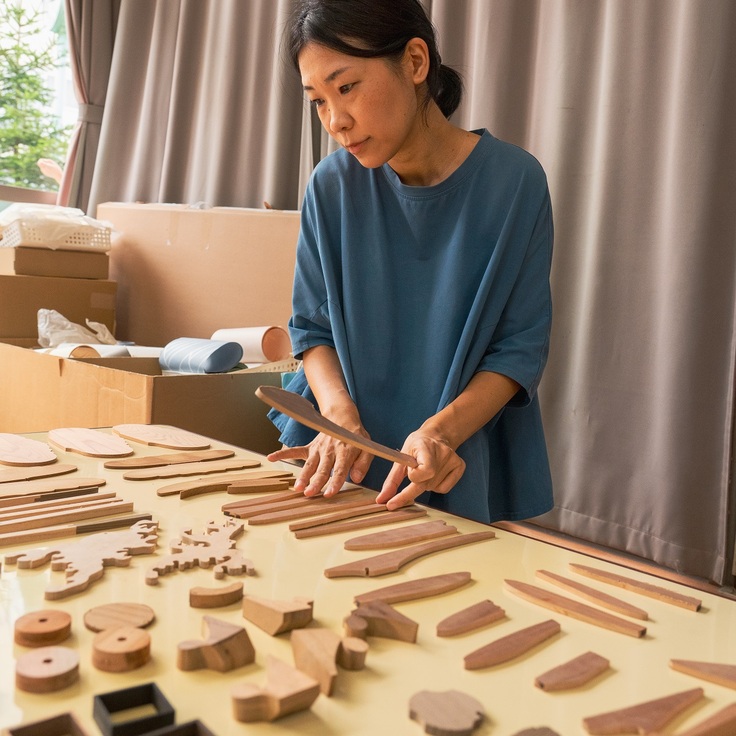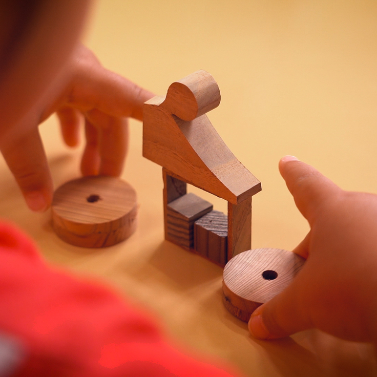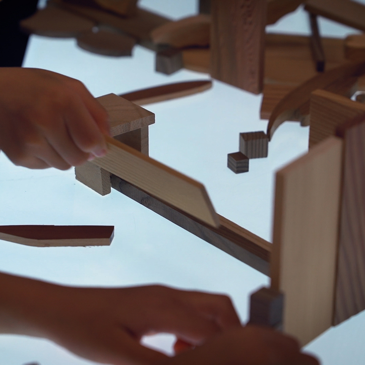 3、4歳児さんたちを対象とする「つくものらぼ」で選ばれた素材は、指物師・川本光春さんからご提供いただいた木の素材。指物の制作段階で発生した端材・余材です。素材の中には、透かしを施すために切り抜かれたものもあって、まさに本物の一部であることがうかがえます。