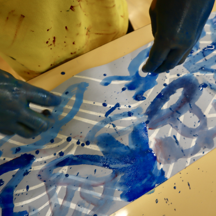 子どもたちは、いつもお絵描きしているようなサイズとは違うキャンバスを前にして、何かを描きたくなったようで、用意された長い和紙に絵具を用いて手でぬたくりしたり、筆を使って手元で何かを描いてみたり。