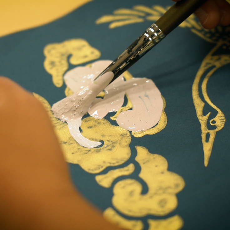 最後に、実際の唐紙をキャンバスとして、その模様の姿かたちから、そこに描かれている意味や物語をそれぞれが読み取り、感じ取り、すでにある模様に何かを描きこんで物語の続きを綴ります。余材や端材であった紙に、子どもたちの創造的なエネルギーが加えられました。