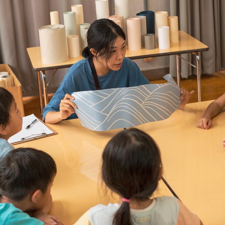 年長組さん(5.6歳児)で選ばれた素材は、表具全般を手掛ける「静好堂中島」さんよりご提供いただいた紙(唐紙)です。子どもたちがふだん慣れ親しんでいる紙といえば薄くて平べったいものですが、今回の紙はすべて丸まっています。アトリエリスタの津田さんから「好きなものをえらんでいいよ」と言われると、まずは筒状になった紙を望遠鏡のように覗き込みはじめました。