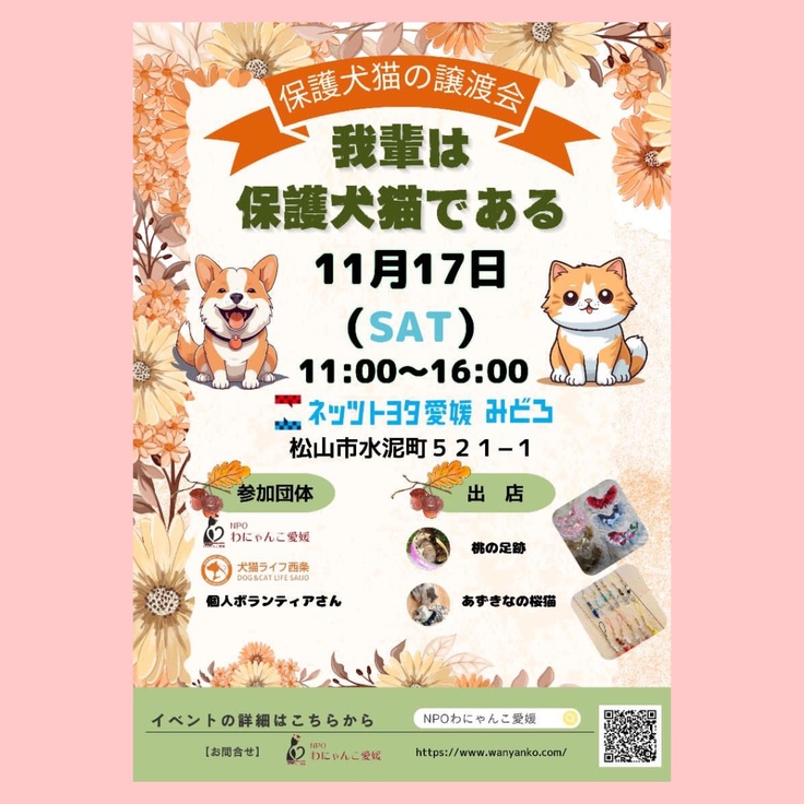 『吾輩は保護犬保護猫である‼️』譲渡会がかいさいされます。愛媛県のかた、いらしてくどさいね