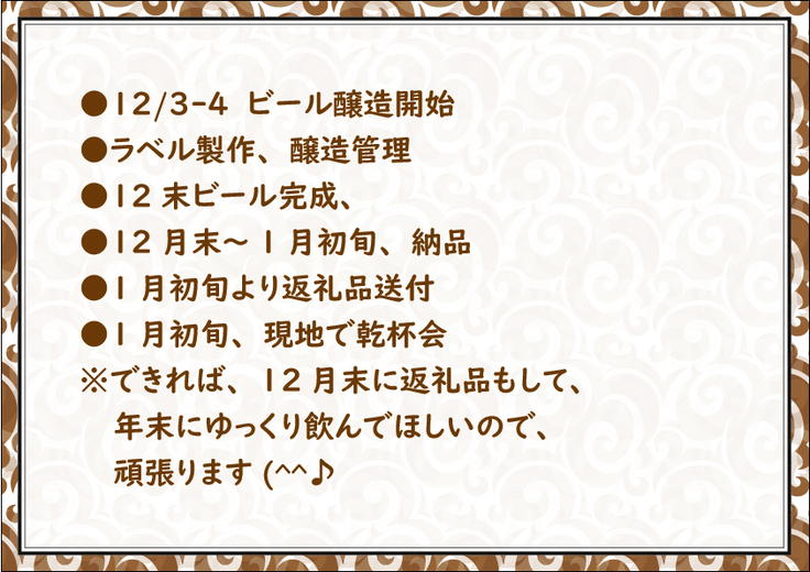 クラウドファンディングも12月末に終了予定なので、できれば、12月末から出来れば、遅くて、1月初旬に返礼品を送付します。