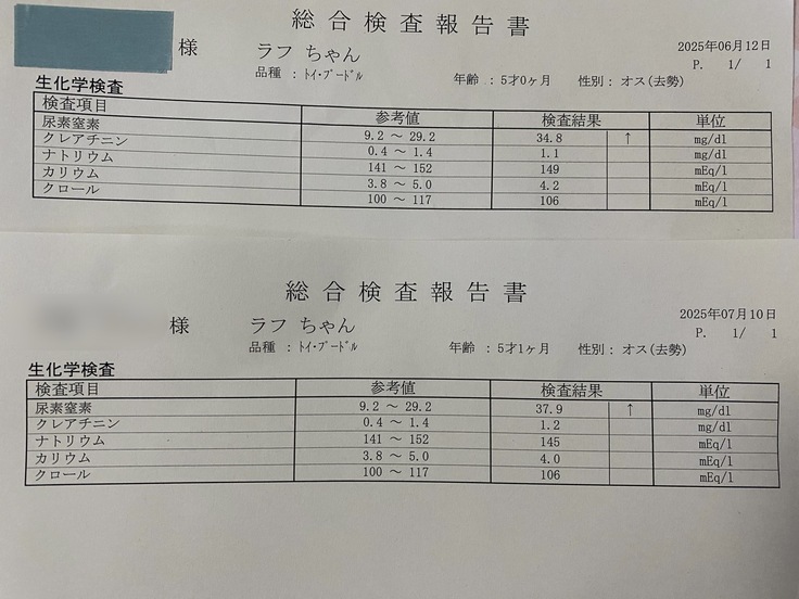 まず腎臓の数値についてですが、尿素窒素は前回よりやや高くなっていたものの、その他の項目は基準値内で、特に問題なしとのことでした。