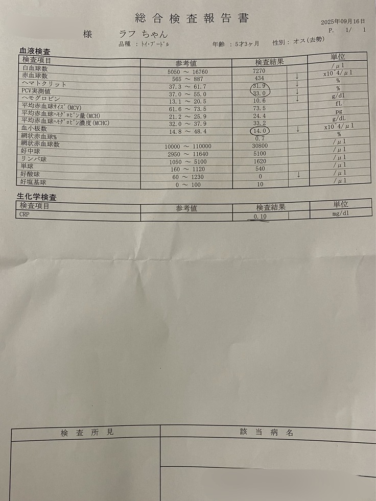 血液検査の結果は少しずつ回復傾向にあり、貧血も改善の兆しが見えてきました。