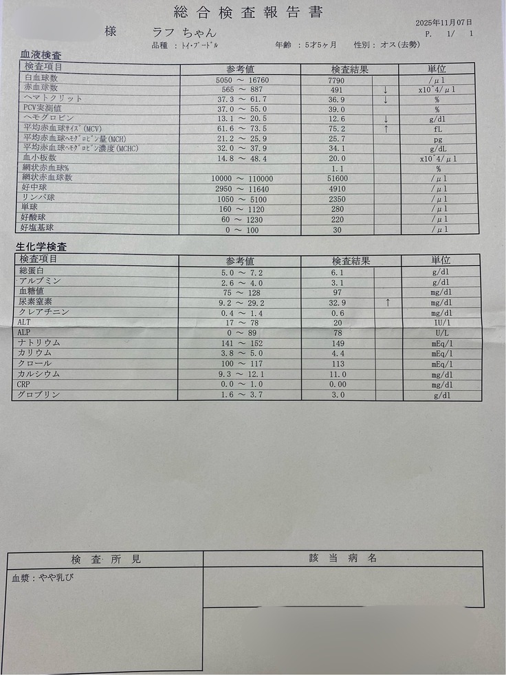 前回から大きな悪化や心配すべき変化はなく、血液検査でも懸念点はありませんでした。