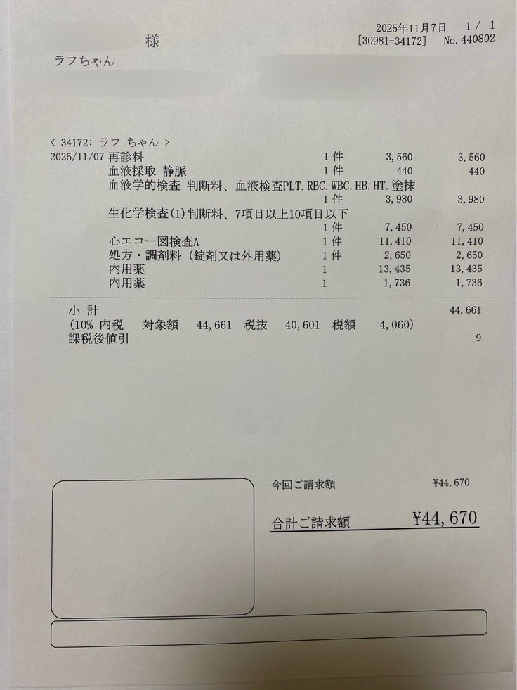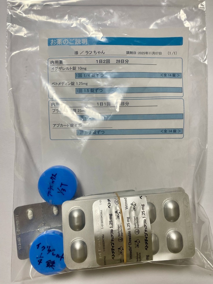 お薬は前回と同じ内容(血栓予防・強心剤・利尿剤)を継続します。