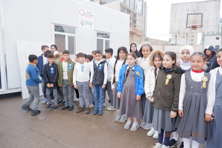 イラクでの主な支援活動の一つに、生徒の教育環境の向上のため学校校舎の建設や修繕を行う、というものがあります。10月には新たに建設されたプレハブ校舎の開校式が行われ、11月には4校のプレハブ校舎ができました。
