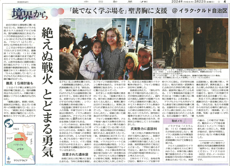 2024年3月22日 中日新聞夕刊「境界から」に、IVYイラク事務所現地職員シランさんに焦点を当てた記事が掲載されました。