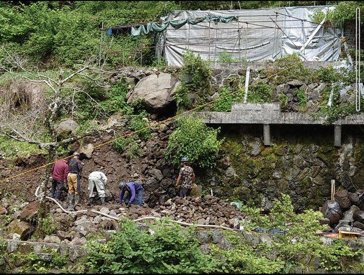 すぐに開始できなかった理由としては崩れた下のわさび沢の方の収穫待ちであった事と業者さんが復旧作業に取りかかれるタイミングが今になった事です。