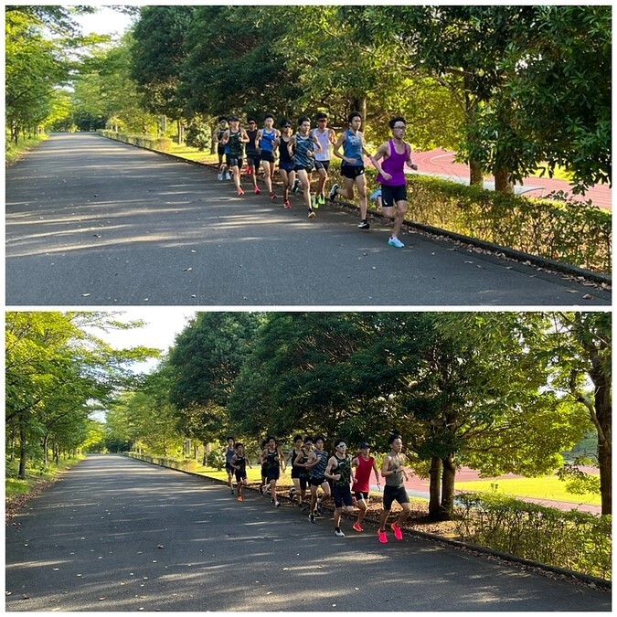 今朝は暑さを避けるために早朝にスピード練習を実施。グラウンドの周りのロードコースは、木陰が多いため暑さは少しは和らぎますが、湿度が高いため練習が終わる頃には選手たちは汗びっしょり。上半身裸になって走っている者もたくさんいました。