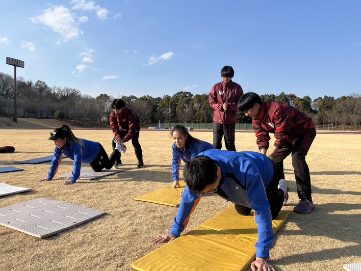 トークセッション後には、グラウンドで競走部・長距離ブロックのメンバーと一緒にストレッチや補強、ジョギングを行いましたが、言葉の壁を感じさせない和気藹々とした楽しい時間を過ごすことができました。