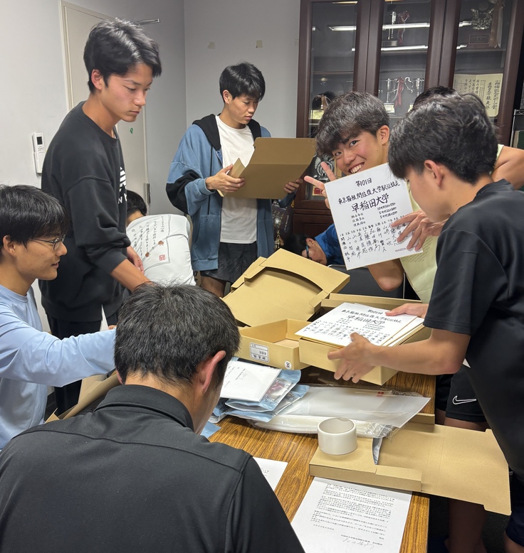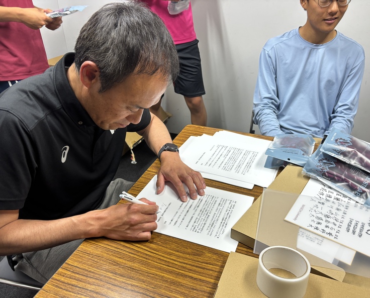 この日はストラップと寄せ書きの梱包を行いましたが、呼びかけに多くの選手たちが手伝いに来てくれて、あっという間に終了。この後、宛名を印刷して順次発送いたします。