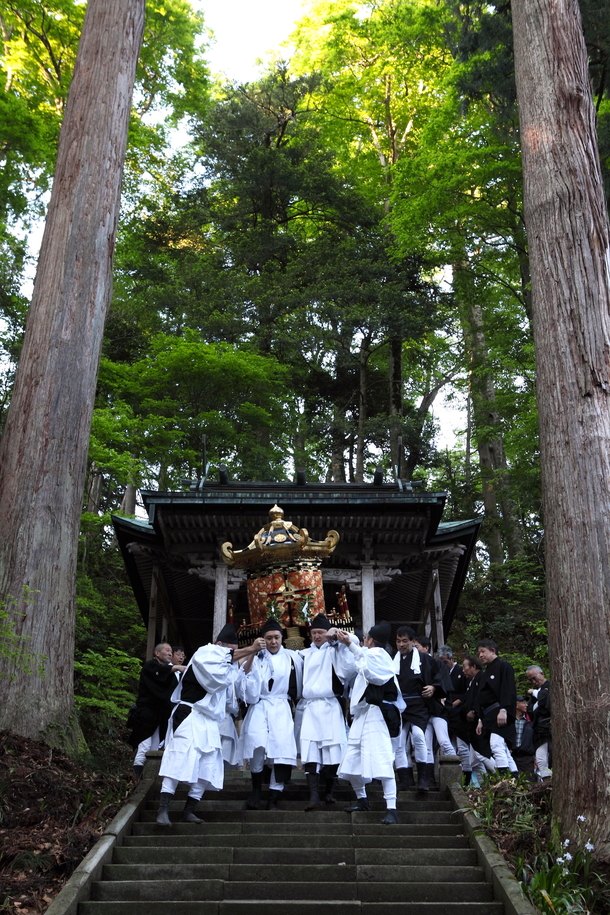奥の院山頂・上宮に鎮座まします神様は、駕輿丁衆が担ぐ神輿で下宮に神幸されます。