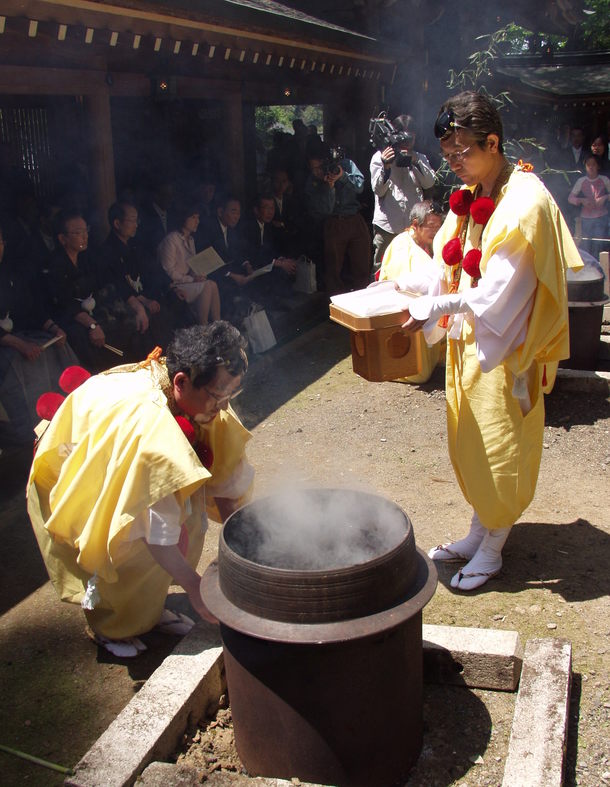 2日目は大祭ならではのハイライト「法華八講」の奉修です。神前に仏法を法楽する神仏習合の真髄です。続いて「湯立ての神事」が斉行されます。