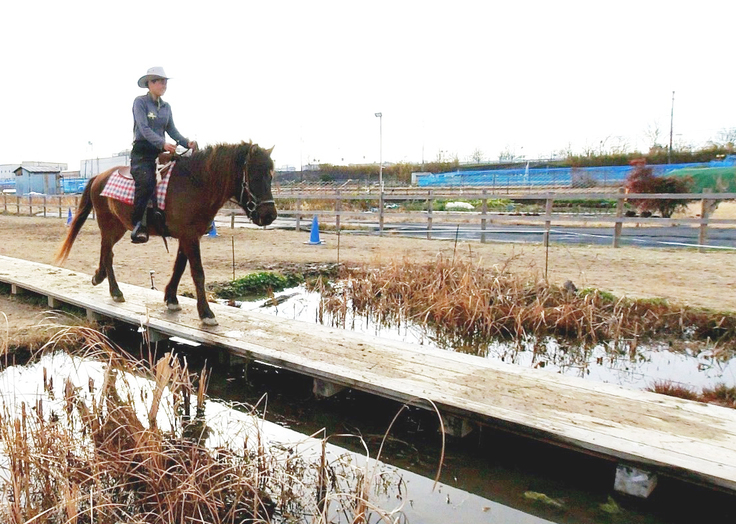 ウエスタントレイルは、アメリカで発達した荒野や野山を馬で旅する技術で、屋外で小回りを効かせて複雑な障害物を乗り越えてゆくものですが、日本ではあまり普及されていません。しかし、小柄ですが脚が丈夫で坂道も平気で、小回りを効かせた動きも上手な和種馬とウエスタントレイルの組み合わせは、新たな試みですが「和種馬の活躍できる機会」として最適であると確信しています。