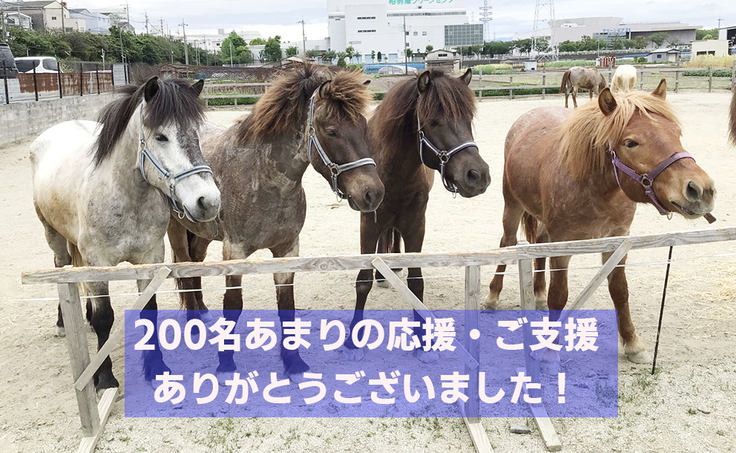 皆様からの応援やご紹介のおかげで、228名の方から3,455,000万円のご支援をいただきました。これほど多くの皆様からご支援いただけたことに感謝するとともに、いただいたご支援は、馬具の新調費や放牧場や馬場の整備費に充てさせていただきます。