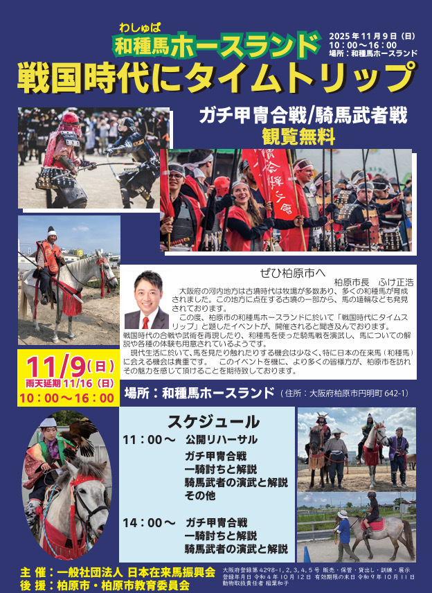 このイベントでは、戦国時代の合戦の再現や、騎馬戦の演武などを通じて、日本固有の在来種(和種馬)たちが活躍した様子を伝えたいと思います。そして現代では、その和種馬達は種類も数も減り、絶滅の危機が迫っている事などをお伝え出来ればと考えています。