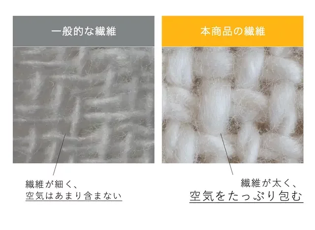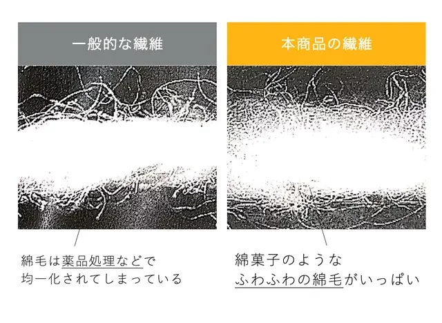 下記は、一般的な製法で紡いだ繊維(左)と、本商品の繊維(右)を拡大比較しています。