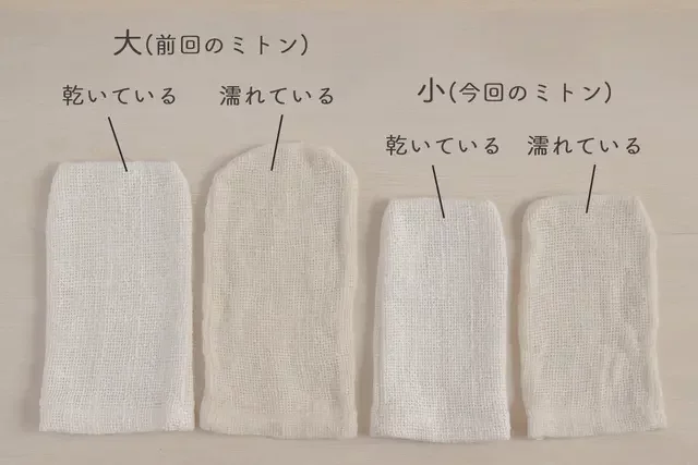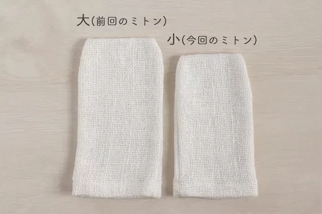 また「ミトン大」は日本人の平均的な男性の手よりも、少しゆとりがあるようなサイズ、「ミトン小」は平均的な女性の手にフィットするサイズで設計しております(ギフトの場合など、手の大きさがわからない場合には、目安にしてください)