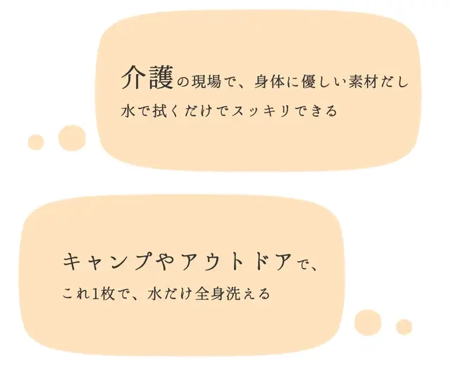 「タオルを使って訪問介護で使っているのですが、ロングタイプほど長いもの使いにくいので、介護者が使いやすい小さいサイズのタオルが欲しいです」と言ったお声をいただくようになりました。