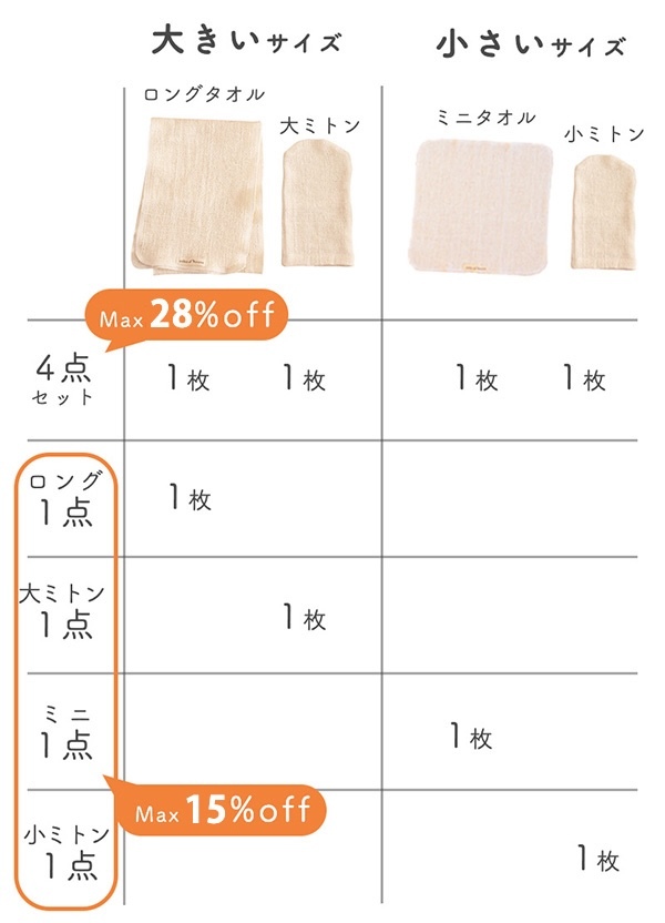 本商品はタオル型とミトン型の2種類。それぞれ前回のサイズより、小さいサイズが新登場。