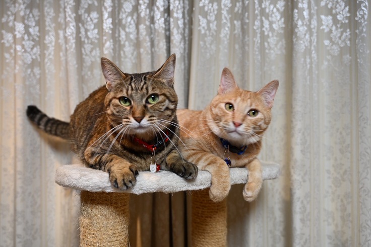 茶トラの茶尾(ちゃお)くん(元の仮名・えびしお)、キジトラの美々(みみ)ちゃん(元の仮名・ぽたぽた)の仲良し2匹兄妹になります♪