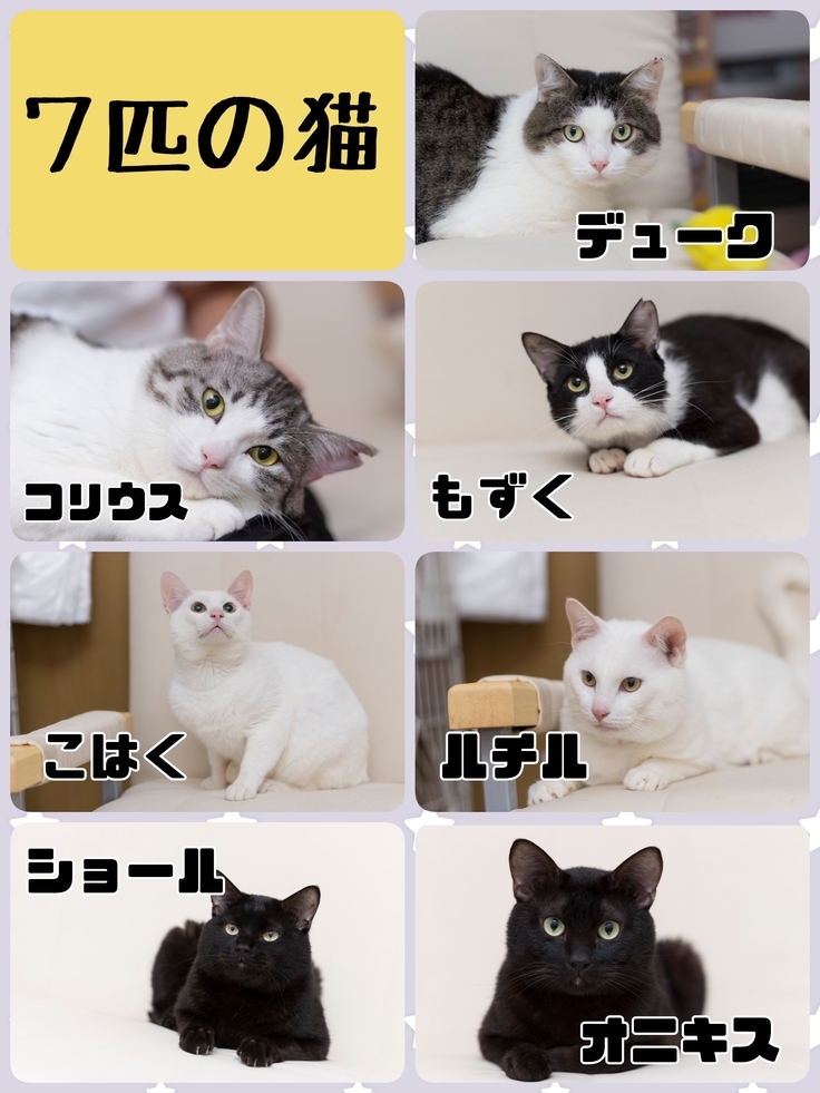 キジ白デューク、黒猫オニキス、黒猫ショール、白猫こはく、白猫ルチル、ハチワレもずく、サバ白コリウスの7匹です。