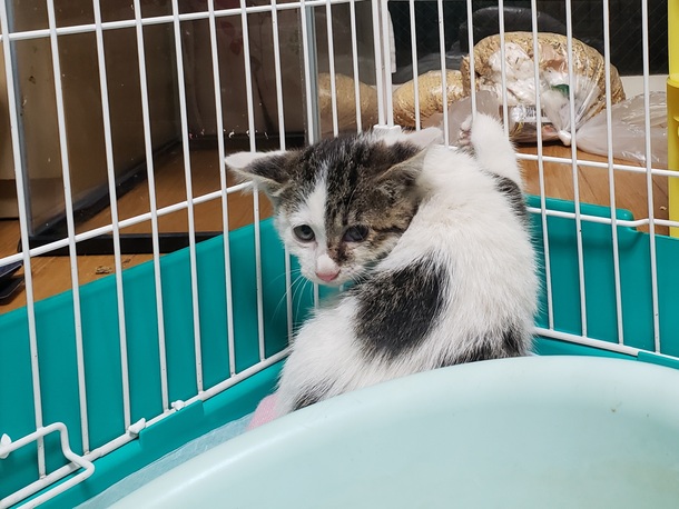 人馴れしていない猫は必ずケージから生活を始めるのですが、ミウィはどうしようもなく何度も行ったり来たりし、最後は水入れに落ちました。