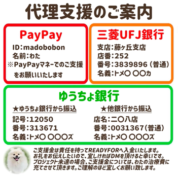 大変心苦しいのですが、日々の治療費など稼ぐことでリターンにかけられる資金がない為、写真付き感謝のメールと活動報告のみでご理解いただけると幸いです。