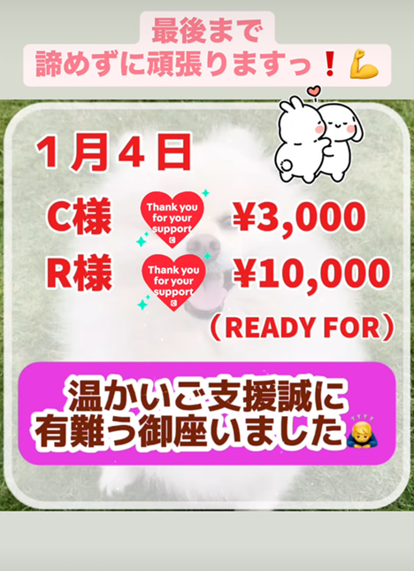 大変心苦しいのですが、日々の治療費など稼ぐことでリターンにかけられる資金がない為、写真付き感謝のメールと活動報告のみでご理解いただけると幸いです。
