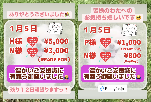 大変心苦しいのですが、日々の治療費など稼ぐことでリターンにかけられる資金がない為、写真付き感謝のメールと活動報告のみでご理解いただけると幸いです。