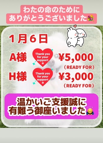 大変心苦しいのですが、日々の治療費など稼ぐことでリターンにかけられる資金がない為、写真付き感謝のメールと活動報告のみでご理解いただけると幸いです。